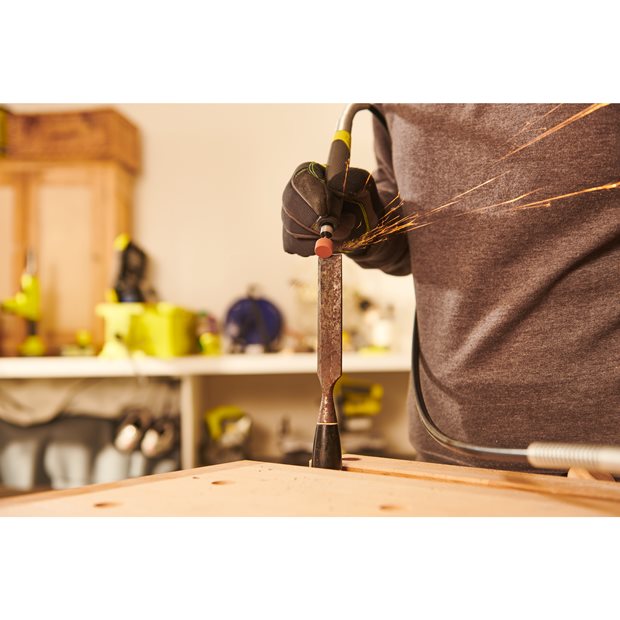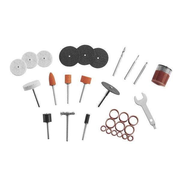 Sandėliavimo dėžutė su 33 priedais: 1 veržliaraktis, 3 šlifavimo diskai, 1 pjovimo šerdis, 4 pjovimo diskai, 1 šlifavimo šerdis, 4 šlifavimo diskai, 1 poliravimo mišinys, 2 šlifavimo būgnai, 12 šlifavimo žiedų, 1 3,2 mm grąžtas, 1 anglies pluošto šepetys, 1 graviravimo antgalis, 1 greitaeigis pjaustytuvas