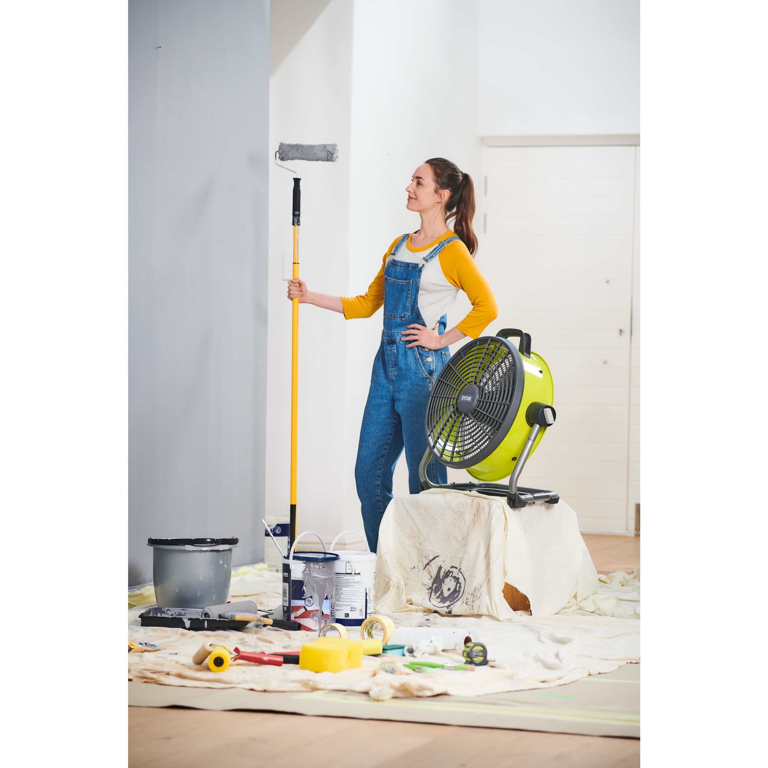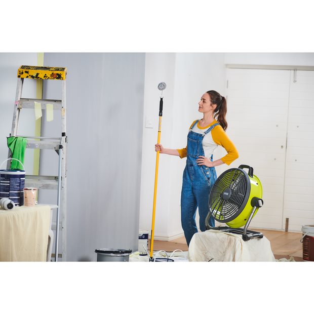 Belaidis ant grindų statomas ventiliatorius puikiai ventiliuoja naujai išdažytas patalpas, servisus ir dirbtuves.